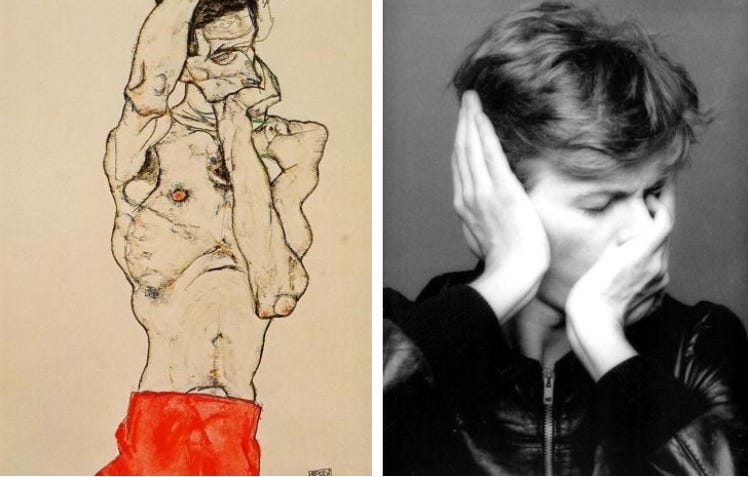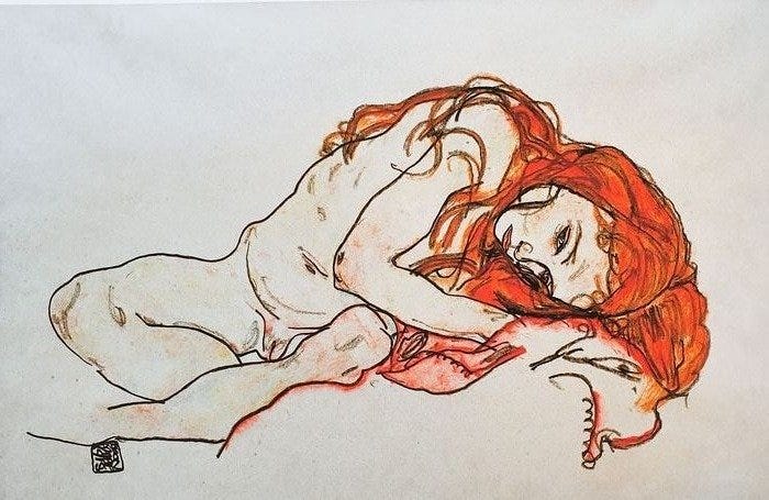 Il sesso è per Schiele il fuoco in cui incenerire queste finzioni già in fiamme mentre l’Europa si incamminava verso il suo primo conflitto mondiale impantanandosi nel sangue di una carneficina folle. Nel calore degli abbracci, negli spigoli ossuti delle sue figure nude si resta impigliati con gli occhi perché testimoniano la pulsione di andare oltre, sfondando ogni convenzione, come nei racconti più scabrosi di Bataille. Mentre l’intero Impero Asburgico scricchiolava sinistramente e tutto sprofondava in un crepuscolo sempre più buio, Schiele, protetto da Klimt, si spinge all’estremità, si fa sbattere in galera dopo una denuncia con l’accusa di aver avuto una relazione con una quattordicenne, mentre già era legato ad una minorenne, Wally Neuzil, sua musa e modella e per poco si perde in questa spirale di carne, piacere e desiderio. Gli bastano pochi segni per delineare interi corpi, corpi che galleggiano in uno spazio bianco, assente, in un paesaggio ormai scomparso, dove l’uomo è solo con le sue pulsioni. L’abbigliamento, l’acconciatura dei capelli, ci mostrano uno Schiele anticipatore un’estetica punk, ma che soprattutto nella contorsione dei corpi rispecchia un disagio esistenziale che è epocale ed emerge codificato e ben raccontato dalla psicoanalisi nella Vienna di Freud.